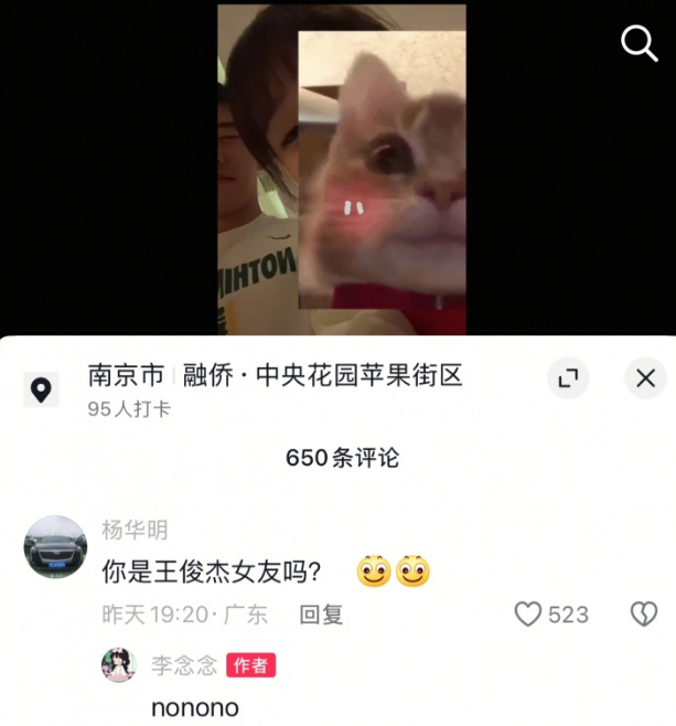 如今有女网友李念念通过社媒晒出与王俊杰的暧昧合拍视频,但女网友给自己的脸部用小猫表情进行遮挡,却还是能够看出来是一位女性。尽管网友询问“你是王俊杰女友吗?”该女网友给出“nonono”的否定答案。